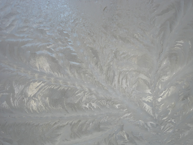 Zijn ze niet geweldig, deze ijsbloemen op het raam van de kas?